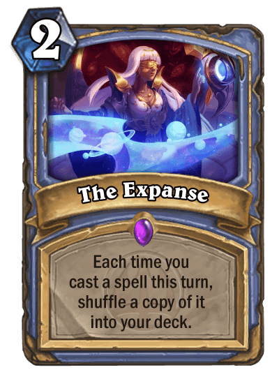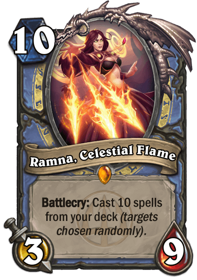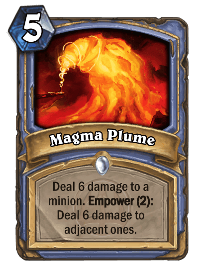 For design of the class cards, I mainly focus keeping the class' theme for the set while also considering how the cards could fit within existing deck archetypes. For example, my Mage set works with shuffling spells into your deck through cards like The Expanse and Gnomish Astrologer to work with Ramna, Celestial Flame as a finisher of sorts. So naturally, I also added some big removal spells like Magma Plume that could work with the many Highlander Control Mage decks popular in standard right now.