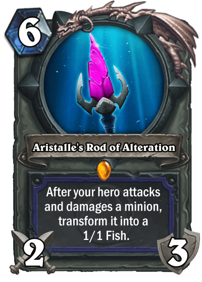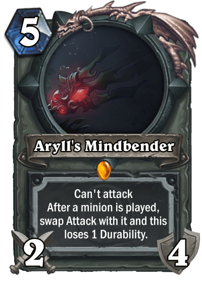 Aryll's Mindbender was a fun card to make. Priest is not a weapon class, so when designing the Trident, I hoped to make something similar to Dragon Soul where it would work as a passive effect. I believe this could lead to some interesting mindgames as it can trigger for both players. Some fun uses could be trying to lock out one of your opponent's minions after playing a 0-Attack minion like Doomsayer, or simply setting up for a Shadow Word: Pain or Shadow Word: Death by "saving" a certain attack number on the weapon and waiting for your opponent to make a move"