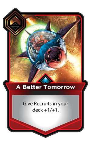 At the bottom of the Recruit you'll find the card's Power in the left corner and it's Health in the right. We'll get into how they work later. The big white spot above it the card's text box, explaining its abilities. Above that is the card's name, then it's rarity cost, and the artwork occupying most of the card.
