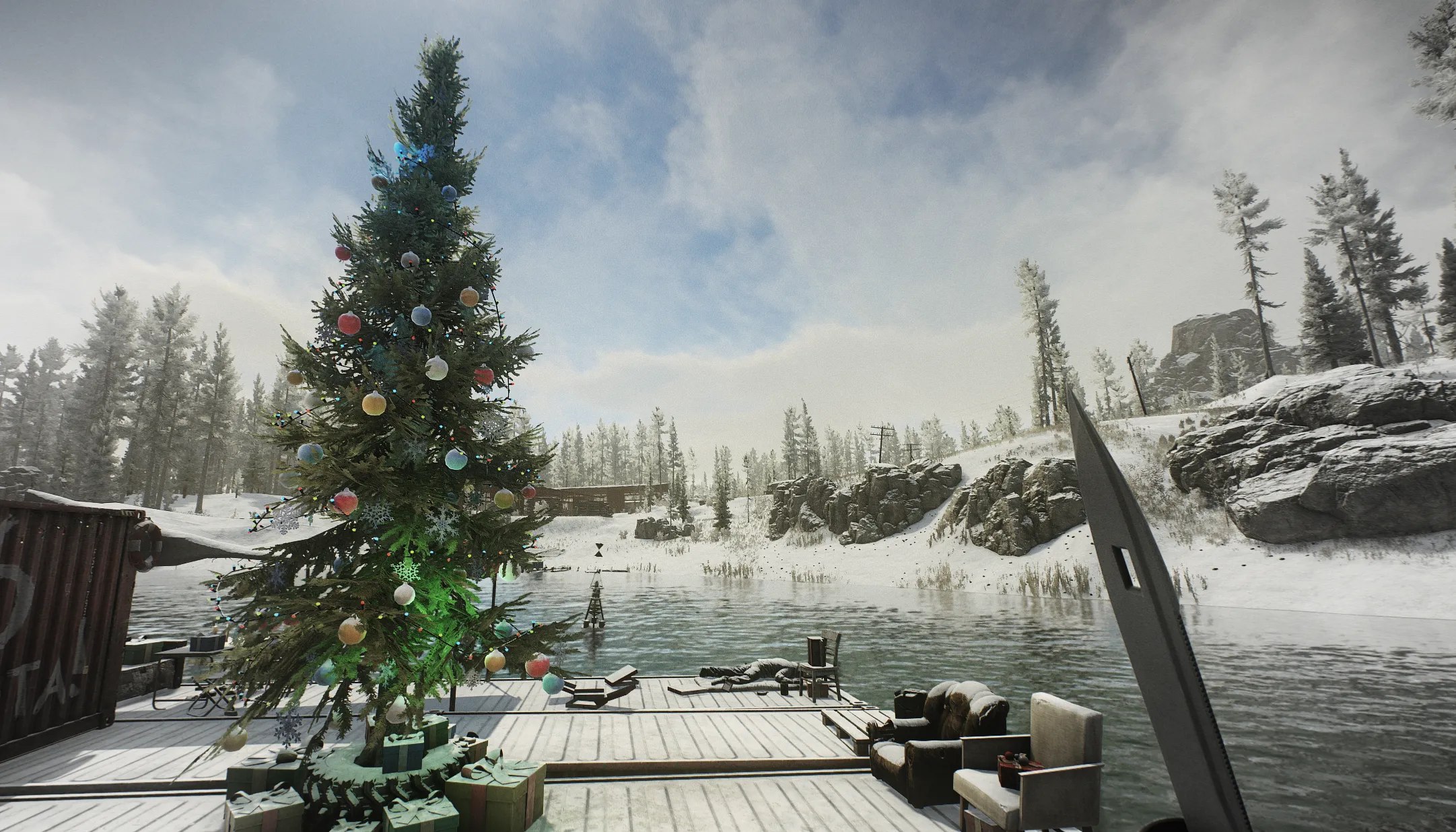 The Christmas Tree on Woods is at the Sawmill area, but this year we find it on a newly accessible dock area. If you know the spot where you need to stash all the gear for Ragman's quest, you're not too far off the new tree location. Here you can see the location when looking down from the sawmill, near the normal dock. You can find gifts on the dock itself, and on the chairs near the tree.