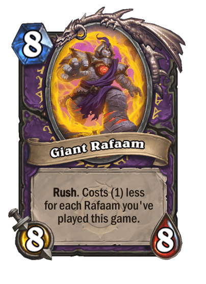 Rush. Costs (1) less for each Rafaam you've played this game.