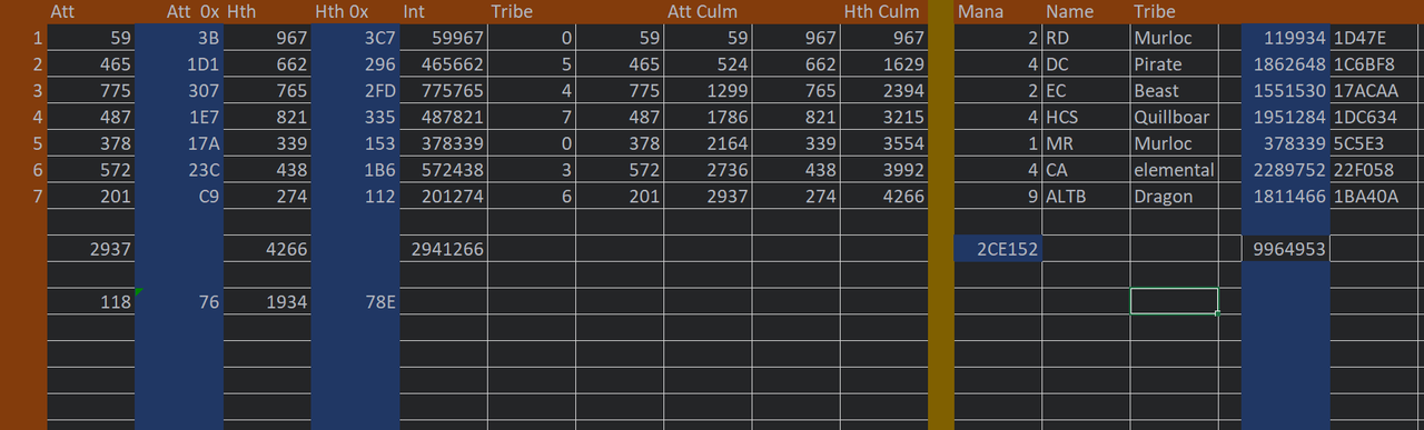 Second one I gave a good go, and did try summing the health and attack mod 1000. Missed the tribe values though.
