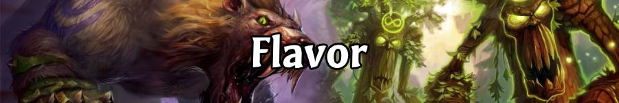 Their main tribe of choice is Beasts, from both natural beasts (i.e, Enchanted Raven or Mounted Raptor) to druids who have the ability to shapeshift into them (i.e, Druid of the Claw or Druid of the Flame). In the context of Hearthstone at least, any type of animal appears to be fair game for a Druid game, whether natural or shapeshifted into. Unlike in Hunter, Druid does not appear to use tamed beast companions and instead is able to harmonize with the wildlife.