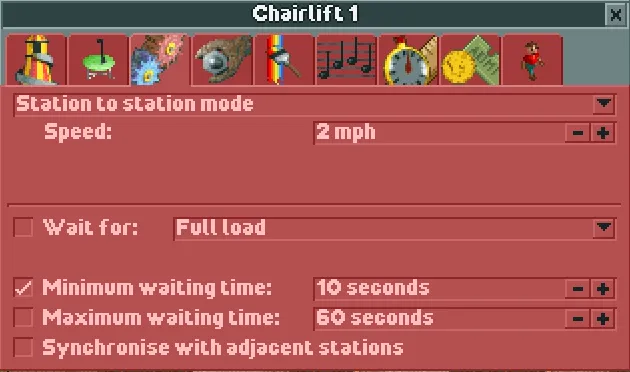The speed of the Chairlift works differently from other Transport Rides. Its speed is a value that you set yourself on a range between 2mph to 9mph (3km/h to 14km/h) and it will always function at that speed. In stark contrast to the other rides which move at a snail’s pace if they need to go up a hill, the Chairlift doesn’t slow down when moving uphill, making it the best option at navigating hilly terrain. Since guests expend more energy when moving on inclines compared to flat pathing, a Chairlift in a mountainous park can help stop them from getting tired too quickly.