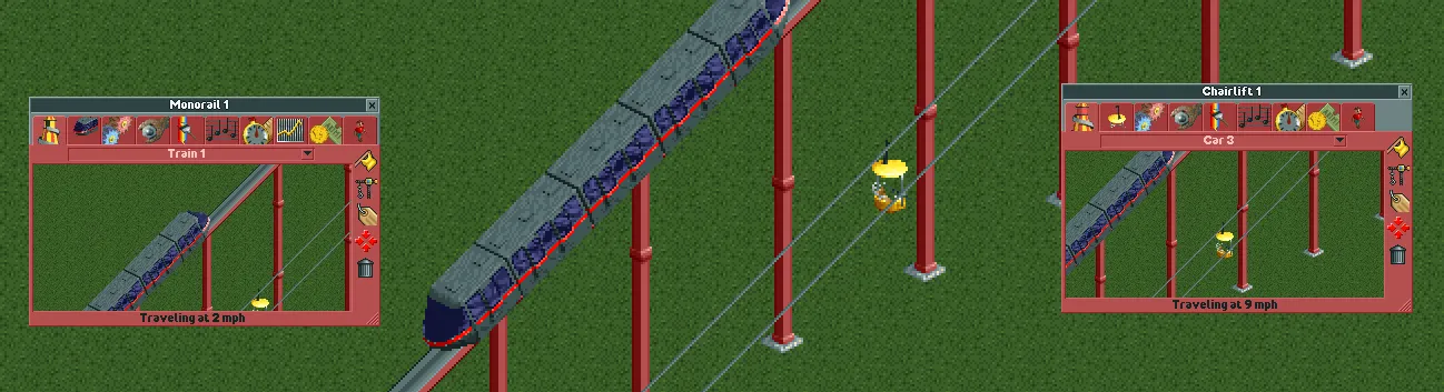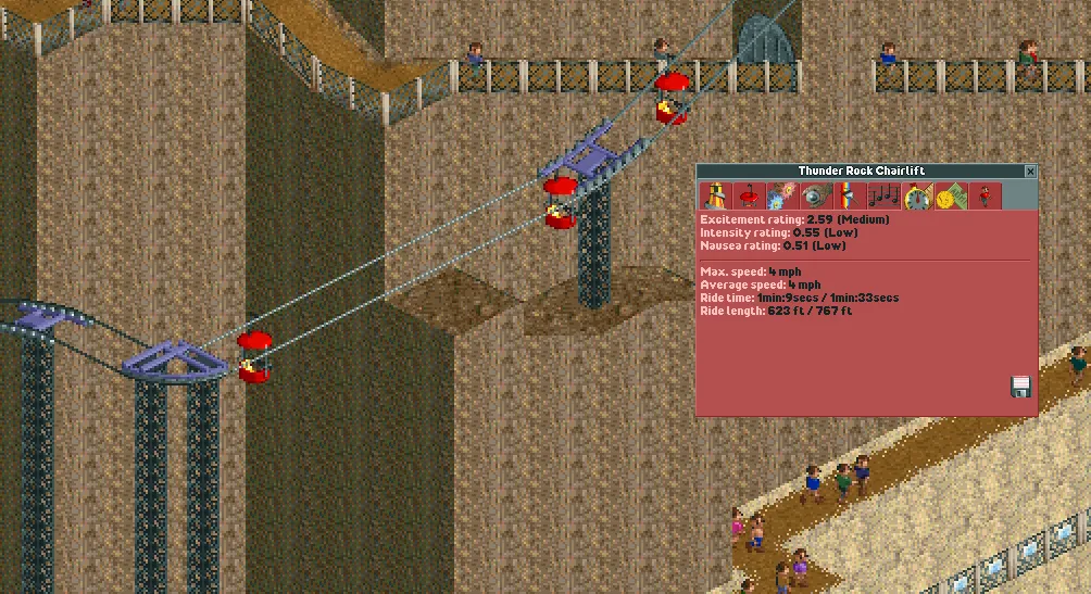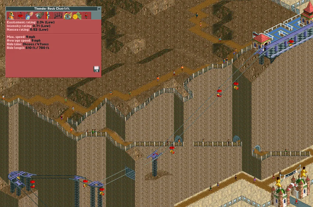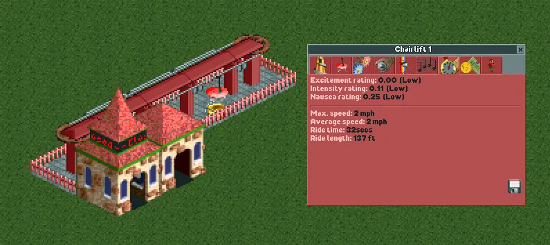 Overall, the Chairlift is one of the better Transport Rides in the game. In spite of its low top speed, it has a number of useful advantages from being incredibly cheap to build, having a very high support limit, having a compact turning radius, and not slowing down when it goes up hill. It's extremely useful for building high over your park and navigating mountainous terrain. If you need height, the Chairlift is definitely the way to go.