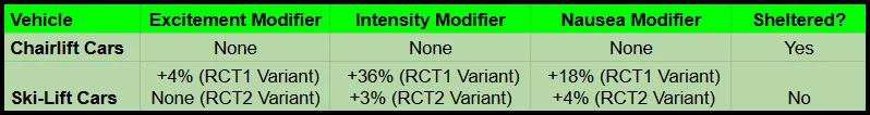 The RCT1 variant of the Ski-Lift Cars have dramatically higher rating bonuses, but because the Intensity and Nausea on the Chairlift is always very low, the effect this has is minimal at best.