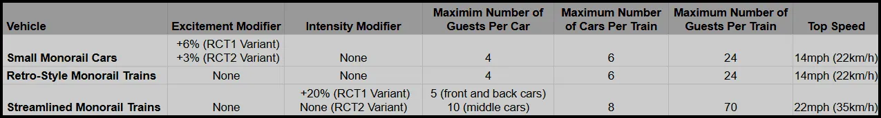 The Small Monorail Cars and Retro-Style Monorail Trains are essentially reskins of each other. They both have a capacity of 4 guests per car with 6 cars per train for a total of 24 guests per train. They each have a top speed of 14mph (22km/h), which are the second-fastest Transport Ride vehicles in the game. The Small Monorail Cars are smaller, meaning that more total cars can fit on the train and their RCT1 and RCT2 versions both have an Excitement modifier meaning that there isn't really a reason to use the Retro-Style Monorail Trains unless you just really like the way they look over the Small Monorail Cars.