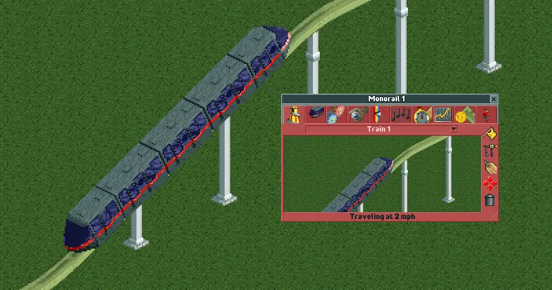 One other downside of the Monorail, which it shares with the Miniature Railway and Suspended Monorail is its incredibly low top speed moving uphill of only 2mph (3km/h), so you should always keep the ride as flat as possible. Due to its support limit, this will be easier to do than the Miniature Railway, but harder than the Suspended Monorail. This also means that the Monorail may be quite difficult to build in parks with lots of sharp elevation changes.