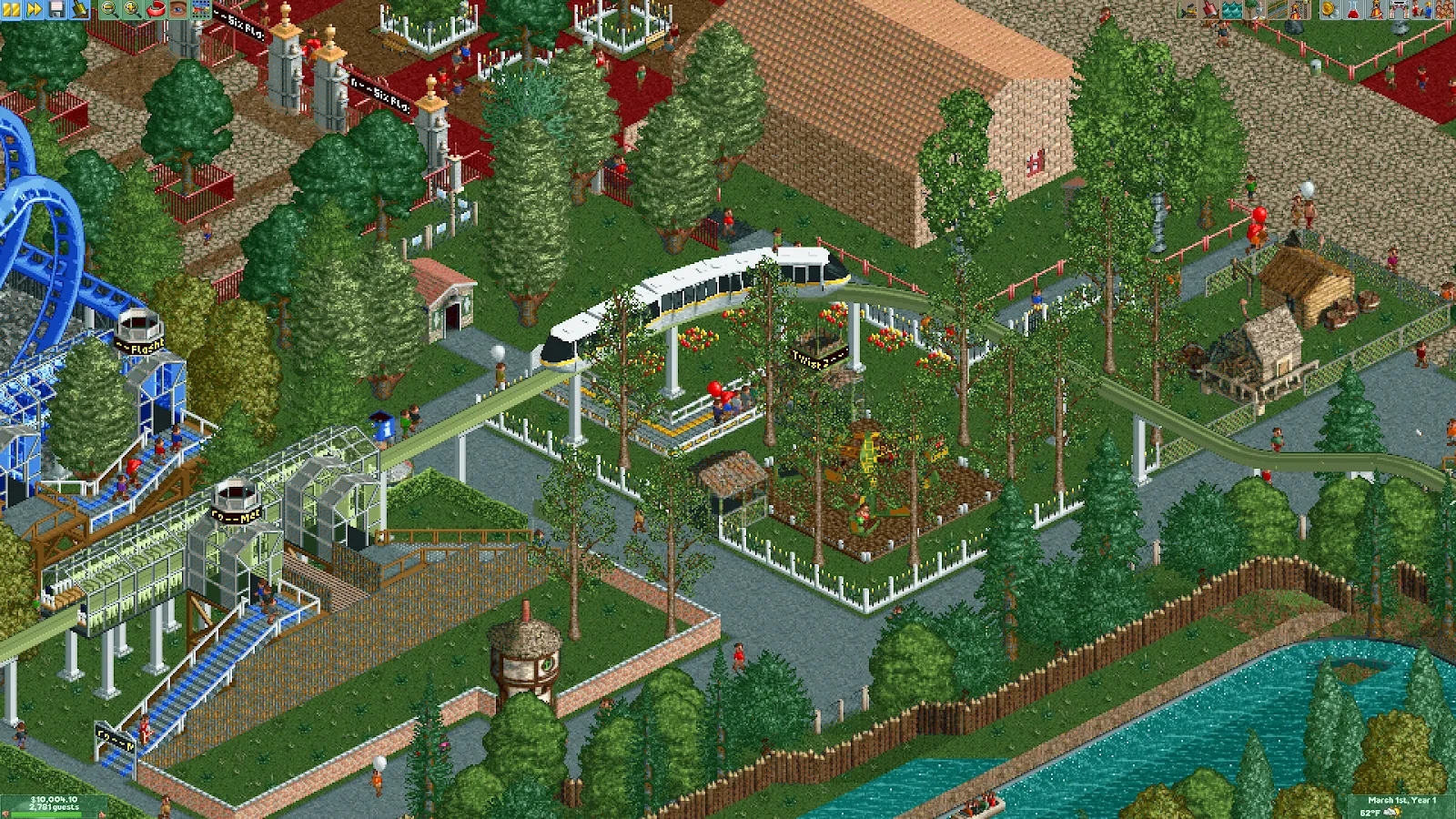The Monorail is basically an upgraded version of the Miniature Railway. It has access to everything that ride has, but it has a slightly higher support and all of its vehicles move faster. The only advantage of the Miniature Railway is that it’s slightly more expensive to build per track piece, although it’s still quite cheap. If one has access to the Streamlined Trains, it’s also the fastest Transport Ride in the game and the one with the highest guest capacity.
