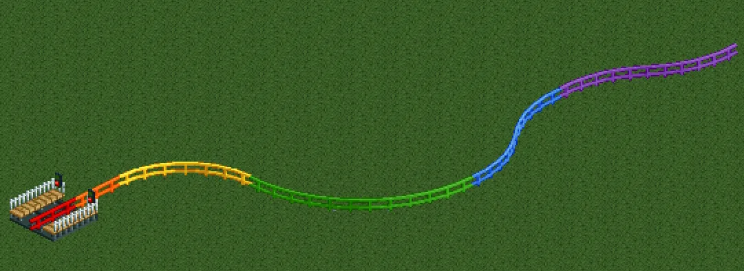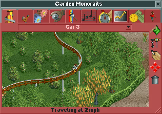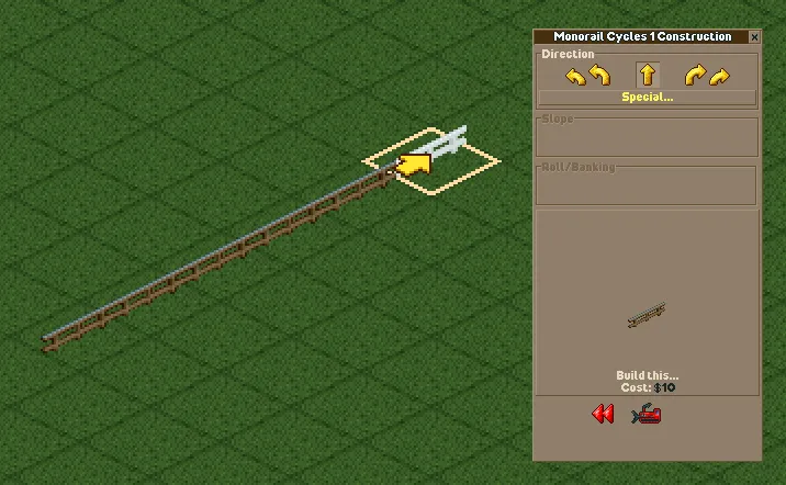 In spite of its severe disadvantages over the other tracked Gentle Rides, the Monorail Cycles does have a small advantage of having the cheapest track pieces of any Gentle Ride in the game with the cost of a station piece being $15.00 and the cost of a straight track piece being $10.00, which is $3.00/$3.70 and $2.00/$2.50 (Vanilla RCT2/OpenRCT2) cheaper respectively than the Car Ride, Mini Helicopters, or Monster Trucks. It also has the lowest length requirement of any ride in the game (not counting rides without a length requirement) of only 140m, which is 20m less than the Mini Helicopters, and 60m less than the Car Ride.