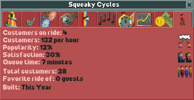 The Monorail Cycles has a lower Excitement value multiplier than either of its brethren, which compounded with its lower average Excitement rating, results in a lower maximum ticket price. At 5-13 months old, the Squeaky Cycles has a maximum ticket price of $2.60. After factoring in its operating cost of $89.60 per hour, this results in a final profit of $222.40 per hour. Factor in the fact that a mechanic will need to fix the ride, and that the ride will experience downtime when it breaks down (and if it rains if you don't cover the ride), and the Monorail Cycles will make so little money that you won't notice the profit it makes. In Vanilla RCT2, this price is $4.20 instead, which is a bit better, but still results in a final profit of just over $400.00 per hour, which most flat rides can beat.