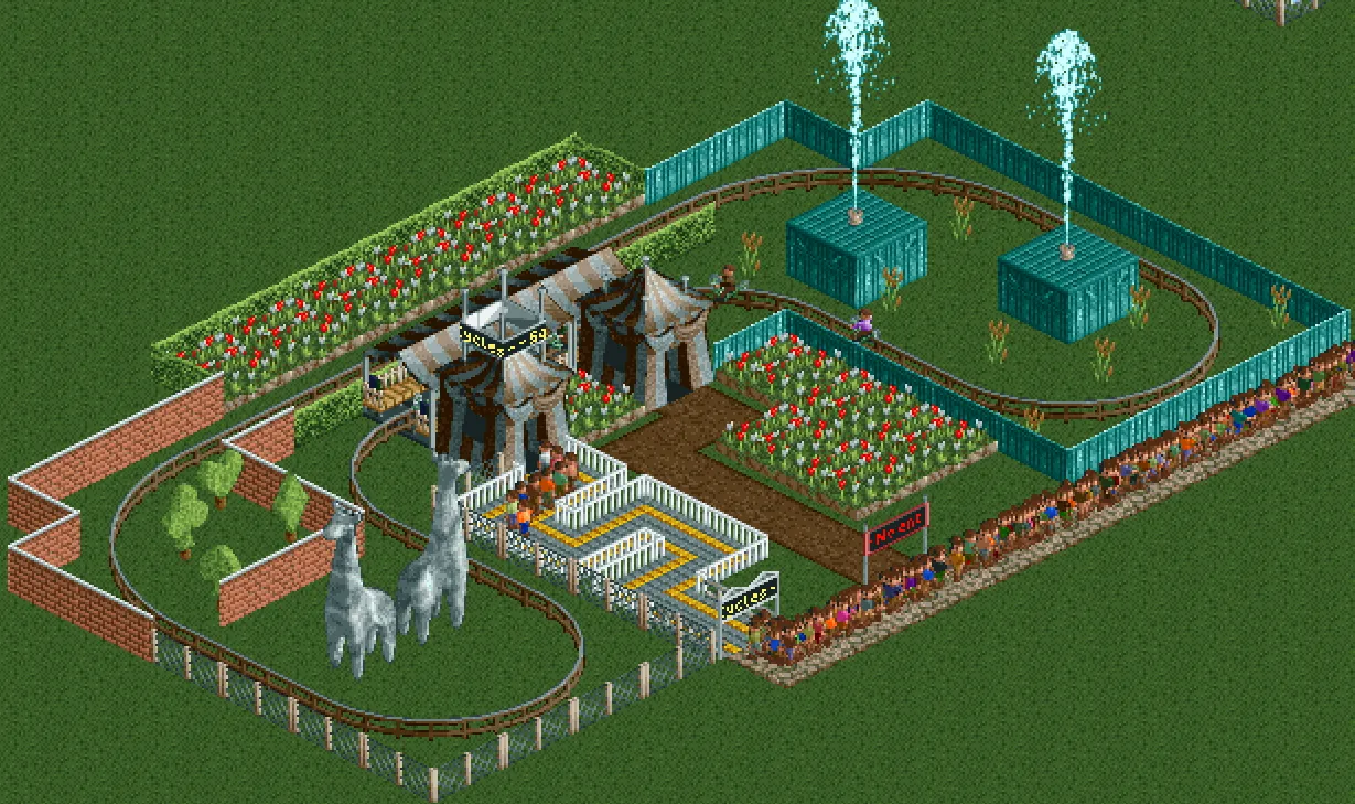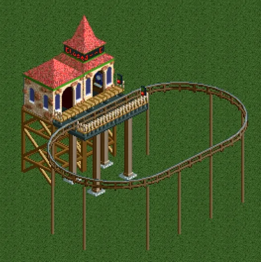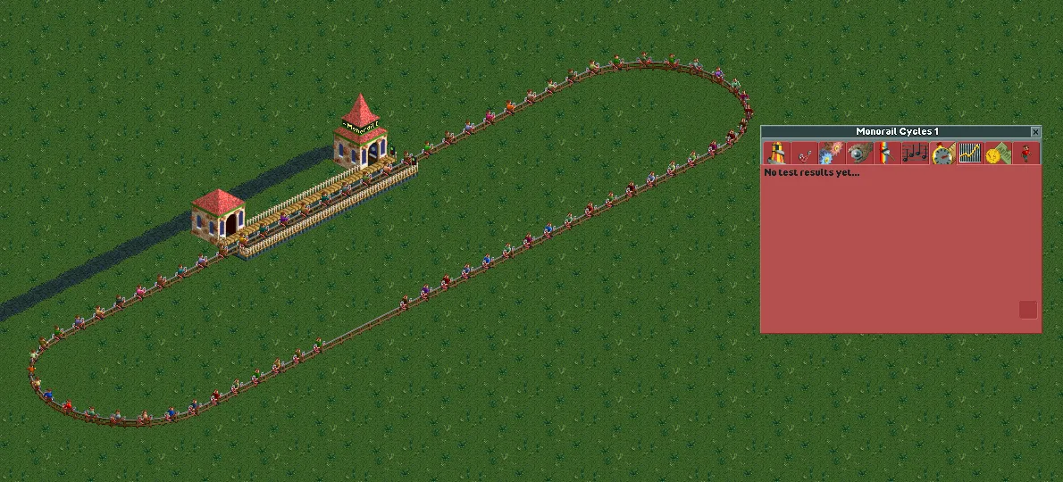 The Monorail Cycles has the worst throughput of any tracked ride in the game; even the Mini Golf usually operates faster than any Monorail Cycles ride. To demonstrate this point, let's look at the Squeaky Cycles pre-built.