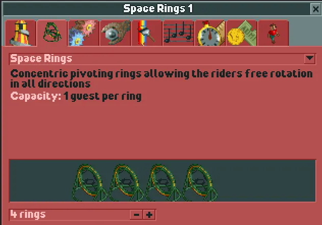In terms of customization, the Space Rings leaves a lot to be desired. The only aspect of the ride that can be altered (other than the colors, price, and inspection intervals) is the number of rings. This number starts at 4, which is the highest amount that the ride can have. There's no intrinsic benefit to ever running the ride with less than 4 rings, so this setting is useless. Always run 4 rings on a Space Rings.