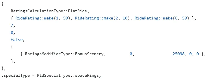 Due to the way its stats and rating multipliers are adjudicated, the Space Rings is one of only two rides in the game in which its Excitement Rating does not contribute the most towards the ride's ticket price or your Park Value (the other being the Air Powered Vertical Coaster) if you don't take advantage of the scenery bonus.