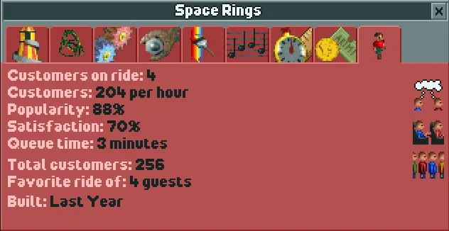 Whenever a guest gets on a ring, it will freely rotate around the ride for about one minute before leaving the ride and stepping out. Unlike most rides, the Space Rings do not need to unload every guest at the same time for new guests to get on. Instead, a new guest can get on the ride as soon as one of the rings becomes unoccupied. However, even with this advantage, it has the smallest maximum capacity of any ride in the game at only 4 guests, and with each guest riding the ride for a minute, this means that the ride will process guests incredibly slowly. Even with a tiny queue line, this can lead to guests complaining that they've been waiting too long to get on the ride. If you build a Space Rings, you may even wish to not build a queue line at all and connect the Entrance building with the main path, but if you do build a queue line, you should keep it to only one or two tiles.