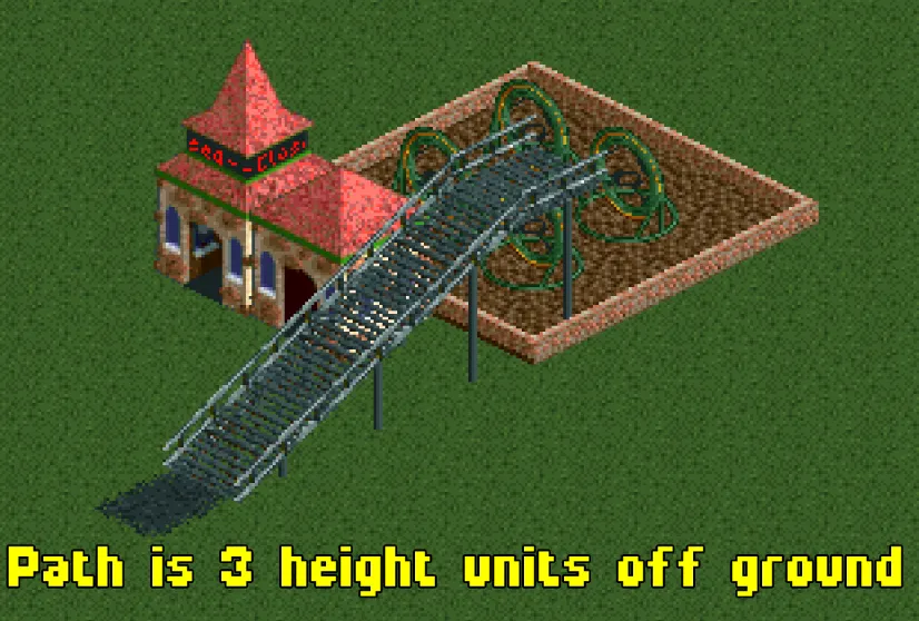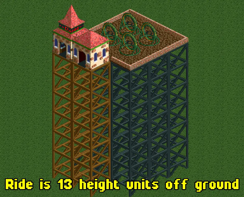 Additionally, It has a massive maximum support height of 13 height units, which is larger than any other Gentle or Thrill Ride in the game. For most practical purposes, this advantage is negligible, but it makes the Space Rings very useful wherever you need to stack a large amount of rides on top of each other. Kinda like a park that's only 15x15 tiles in size, right? These two advantages compound off of each other. Assuming they're all built on ground level or above, you can stack up to 5 Space Rings in the same 3x3 area.