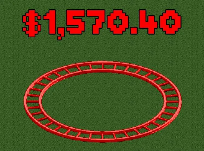 The Air Powered Vertical Coaster is infamous for how absurdly expensive it is to build. A single station piece costs $150.00 to build and a straight track piece costs $100.00 to build. The coaster is so expensive that this small ring of track consisting exclusively of 4 turn pieces costs over $1,500.00 to build.