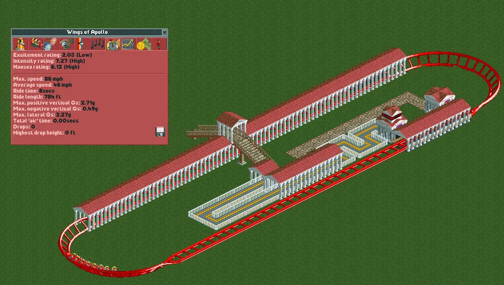 As a result of this, the ticket price doesn't generally take a huge hit by failing the stat requirement. Without failing the stat requirement, Wings of Apollo can have a ticket price of $20.00 for 40 months or 5-in game years (assuming it's the only Air Powered Vertical Coaster in the park). Nearly every scenario across both games takes either this long or less time to complete, so you can easily set it to the maximum ticket price and forget about it.