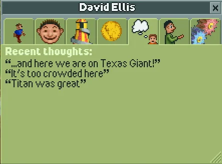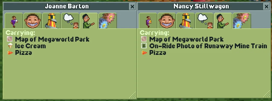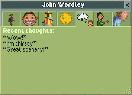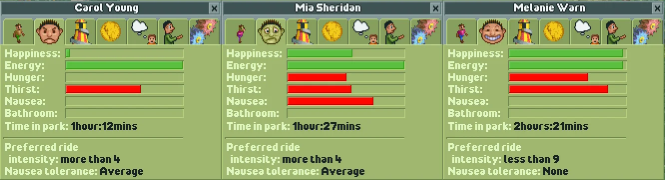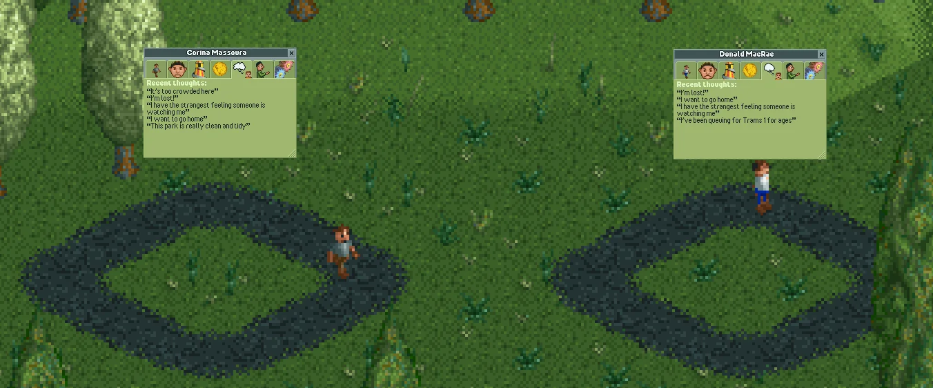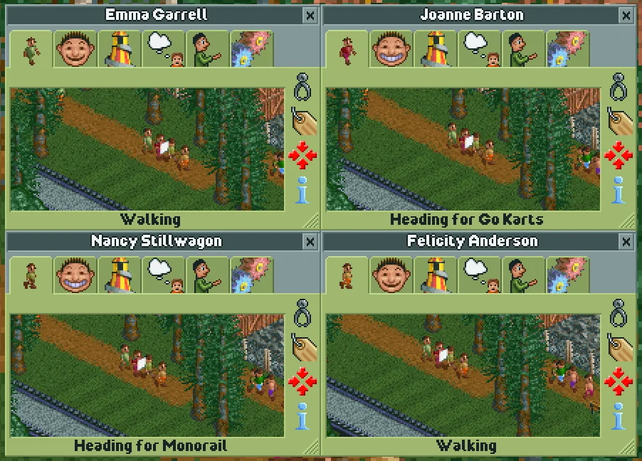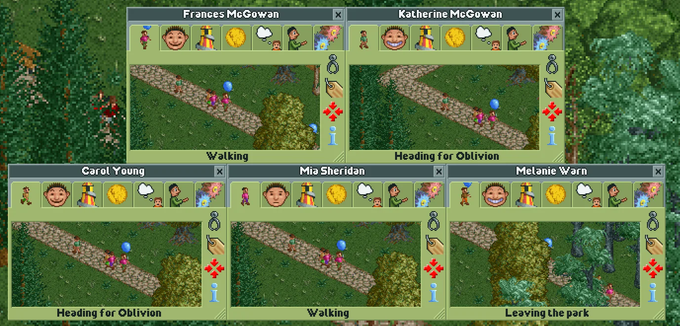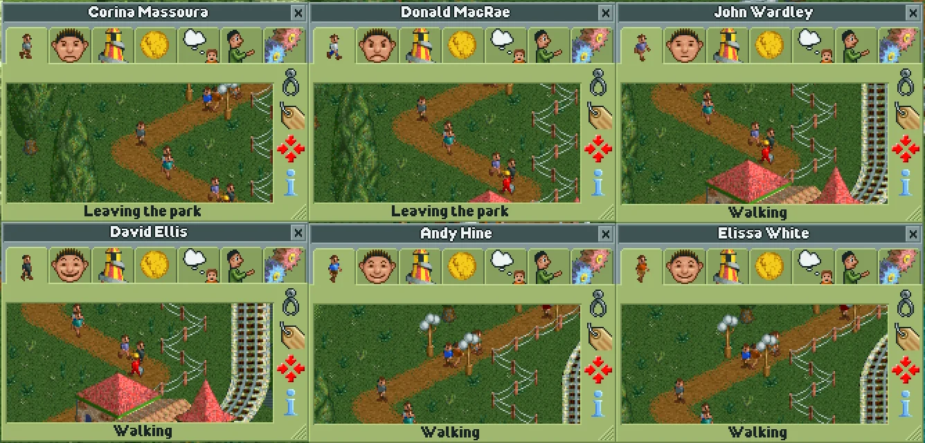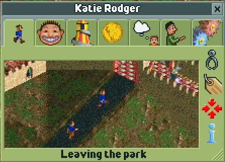 The final cheat doesn't fit into either of the above categories. Naming a guest Katie Rodger will make them immediately start heading for the park exit. If they're currently heading for a ride, their current action won't change to "Leaving the park", but they will continue walking towards the park exit and leave the park anyway.