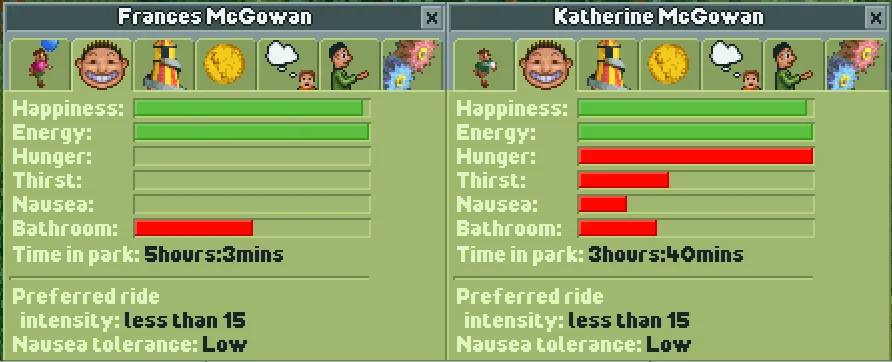 - Frances McGowan will have her Bathroom stat increase incredibly quickly and will need to use the Toilets in your park much more frequently.