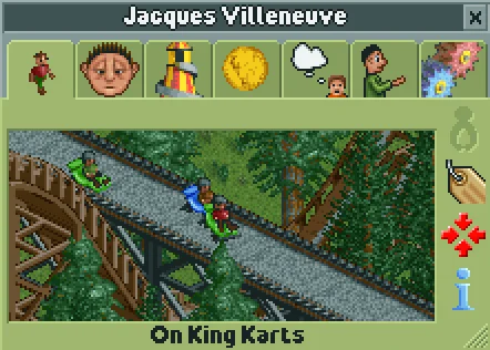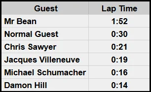 (Guests named Jacques Villeneuve, Michael Schumacher, and Damon Hill driving on King Karts in Karts & Coasters)