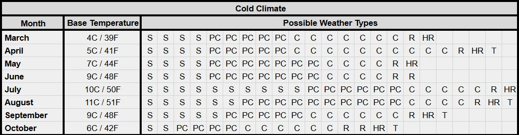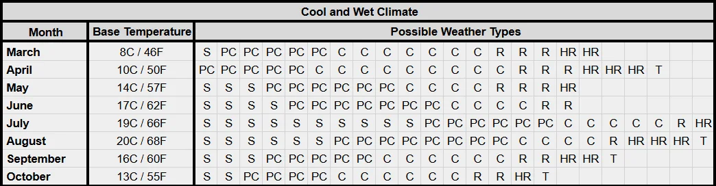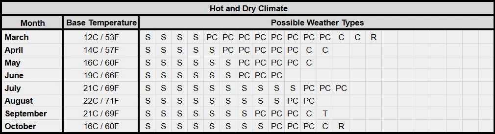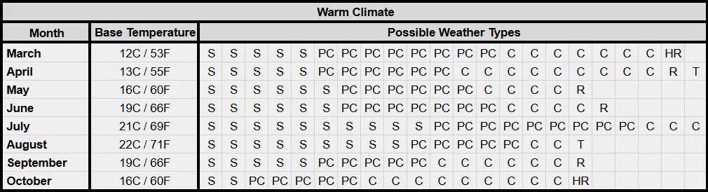 Each climate affects how likely a certain weather type can occur within a given month. Below are the lists of every month's base temperature and possible weathers in all climates.