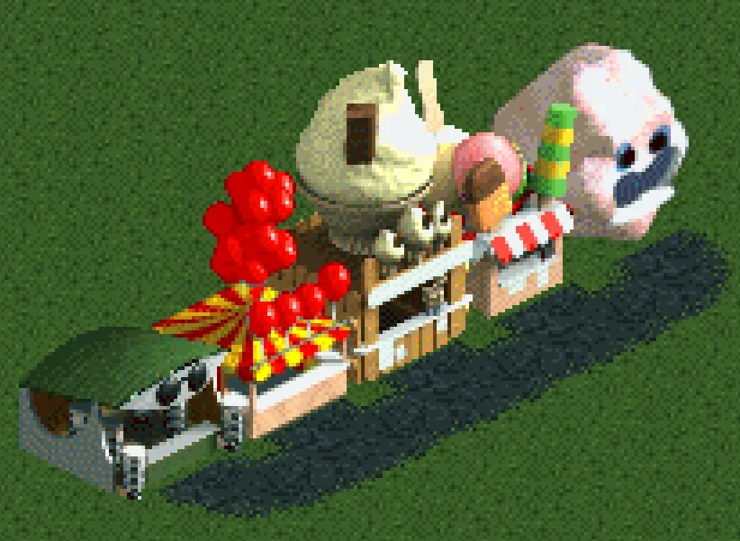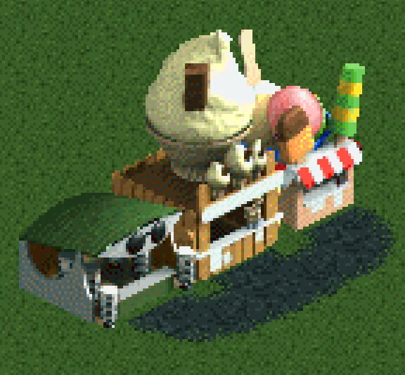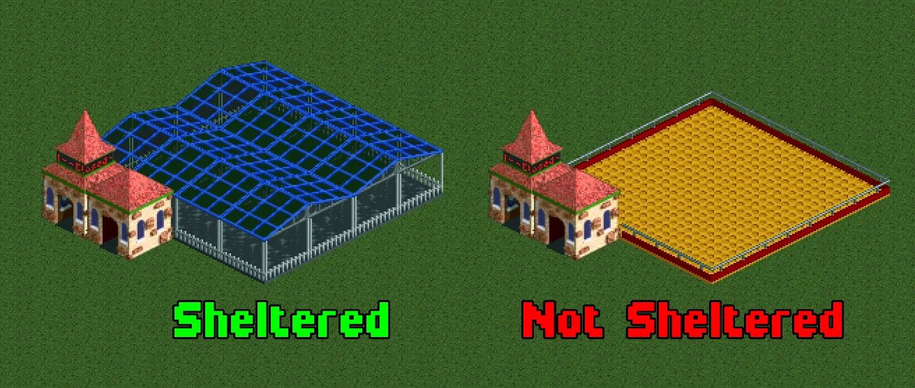 Additionally, certain vehicle types can render rides to be sheltered or unsheltered. Once again, this is quite intuitive to understand. If the vehicle has a roof, the game will generally consider it to be sheltered. An example of this interaction can be seen on the Car Ride since there are vehicle types on the ride that are considered sheltered or not sheltered. Cheshire Cats for instance are not sheltered vehicles, meaning that the ride will only be considered sheltered if at least 3/8 of the track is considered sheltered.