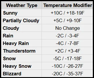 Each type of weather also has a temperature modifier value attached to it, and whenever a weather type changes to another weather type, it will change the temperature to reflect the change in the temperature modifier.