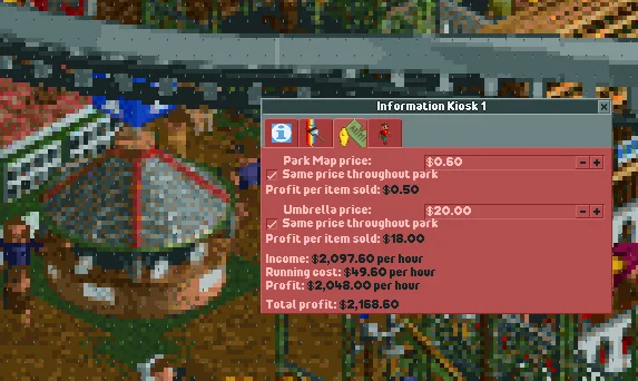On the other end of the spectrum, one of the most well known exploits in the game is that people will buy umbrellas at any price while it's raining. By default, the maximum amount of money guests will pay to buy an umbrella is $5. However, while it's raining, they will pay any price provided they can afford it. Under normal circumstances, the maximum amount you can charge for them is $20, however if you use cheats to charge more than this, they will be willing to pay whatever you set the price to in order to buy an umbrella during a rainstorm.