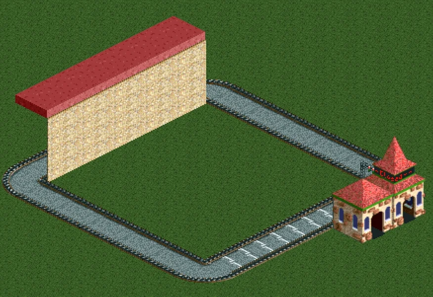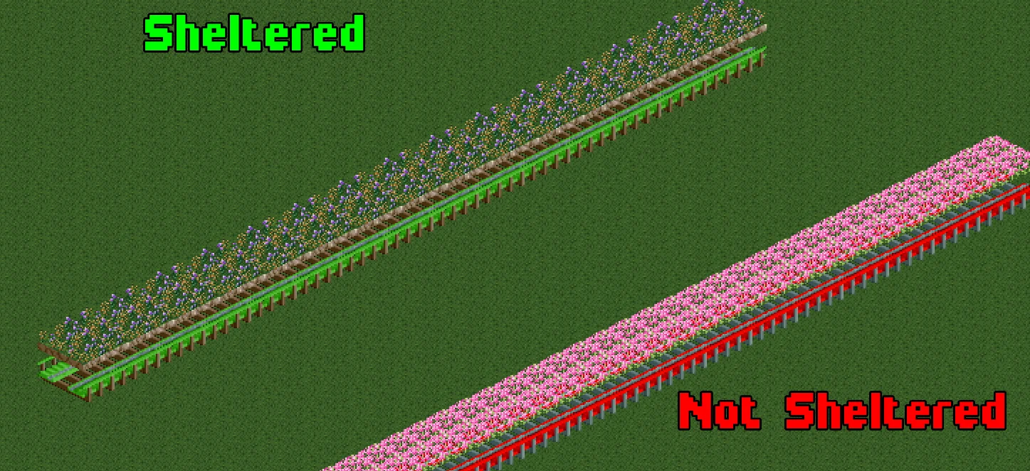 Whether or not scenery tiles count towards sheltering the ride is determined by the side of the object. Only objects that are at least one full tile in size will count towards the sheltering requirement. Below you can see a green coaster track covered by full-tile flowers, and a red coaster track covered by quarter-tile flowers. As a result of this quirk, the game will considered the green coaster to be sheltered by the scenery, where the red coaster is not sheltered even though they both look like they should have the same amount of rain coverage.