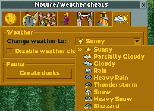 OpenRCT2 also adds Snow, Heavy Snow, and Blizzard to the game. For nearly all purposes, these are effectively just the three stages of rainy weather reskinned, but while Heavy Snow and Blizzard count as rain, Snow does not. It's not possible to experience either Snow type without using cheats, but you can use these cheats to change the weather to any type at any time and even freeze the weather changes.