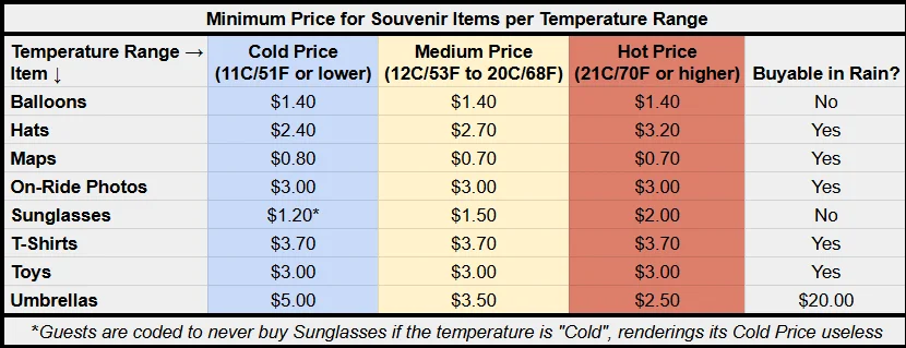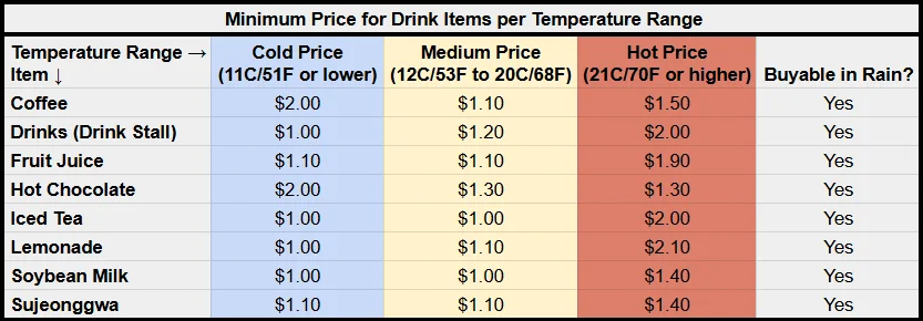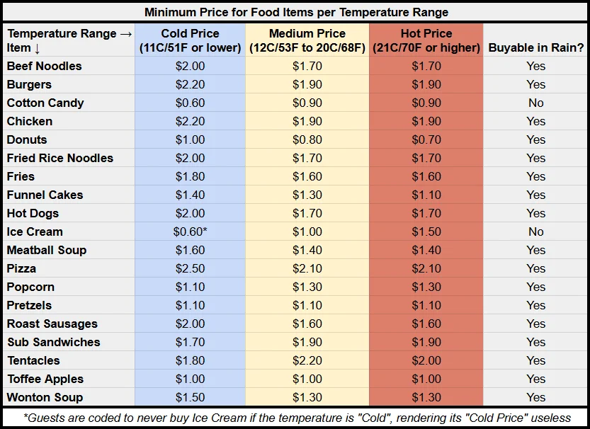 Below are tables for the minimum price every stall item in the game can be sold at per temperature range. There are other factors that can increase the price that guests are willing to pay, but it will never go below the prices in these charts.