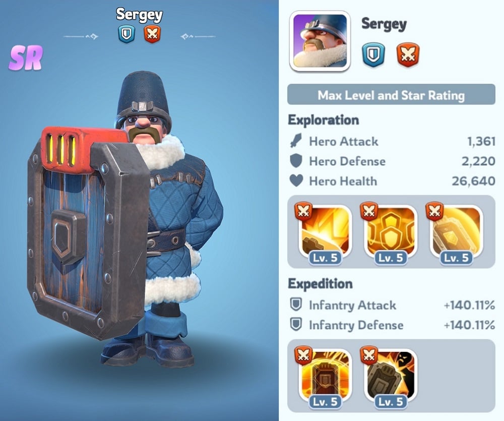 - Defenders' Edge - Sergey guards our troops with his shield, reducing damage taken by 4%/8%/12%/16%/20% for all troops.